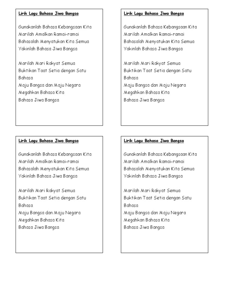 Lirik Lagu Bahasa Jiwa Bangsa. Buktikan Taat Setia dengan Satu Bahasa. Buktikan Taat Setia dengan Satu Bahasa.